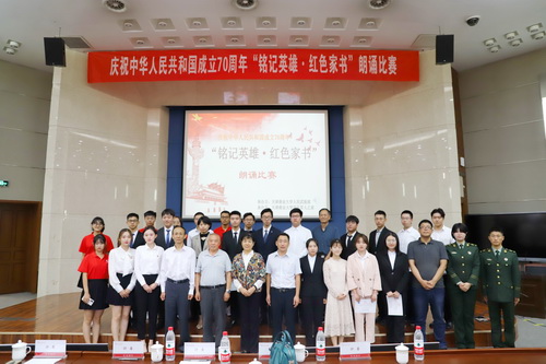 在中华人民共和国成立70周年之际,9月29日,人民武装部举行庆祝中华人民共和国成立70周年“铭记英雄红色家书”朗诵比赛,缅怀革命先烈,重温革命历史,传承红色基因。学校关心下一代工作委员会、党委老干部处推荐薛宗厚、马富忠、肖培荣、邢素军担任比赛评委,各学院遴选的13支团队参加比赛。