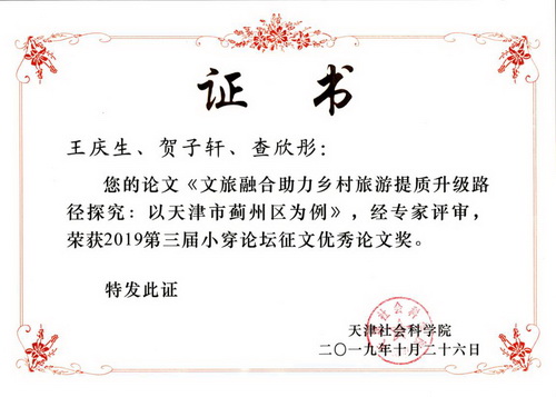 论坛以习近平新时代中国特色社会主义思想为指导,精准聚焦于乡村振兴、乡村旅游和全域旅游三方面,积极探索农村农业发展新模式,得到了天津市政府和各界专家学的大力支持。论坛召开前的论文征集,共收到全国20个省(市)高校、社科院、政府部门以及科研智库机构等54位作者的论文70篇,其中评出优秀论文10篇。管理学院有4篇论文入选论文集,王庆生、贺子轩、查欣彤的论文“文旅融合助力乡村旅游提质升级路径探究:以天津市蓟州区为例”获优秀论文奖。