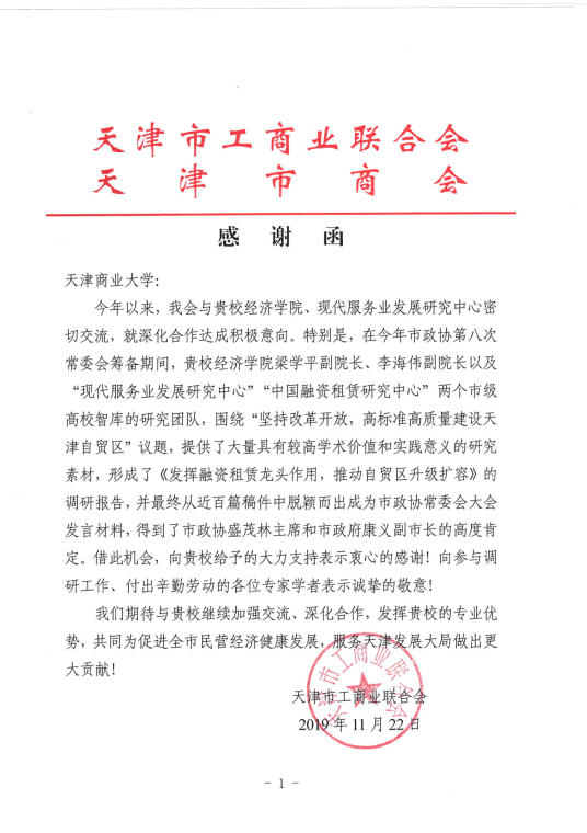 近日,天津市工商业联合会、天津市商会发来感谢函,对永利官网经济学院、现代服务业发展研究中心、中国融资租赁研究中心在课题研究、专题调研等方面进行合作以及取得的成果表示感谢。
