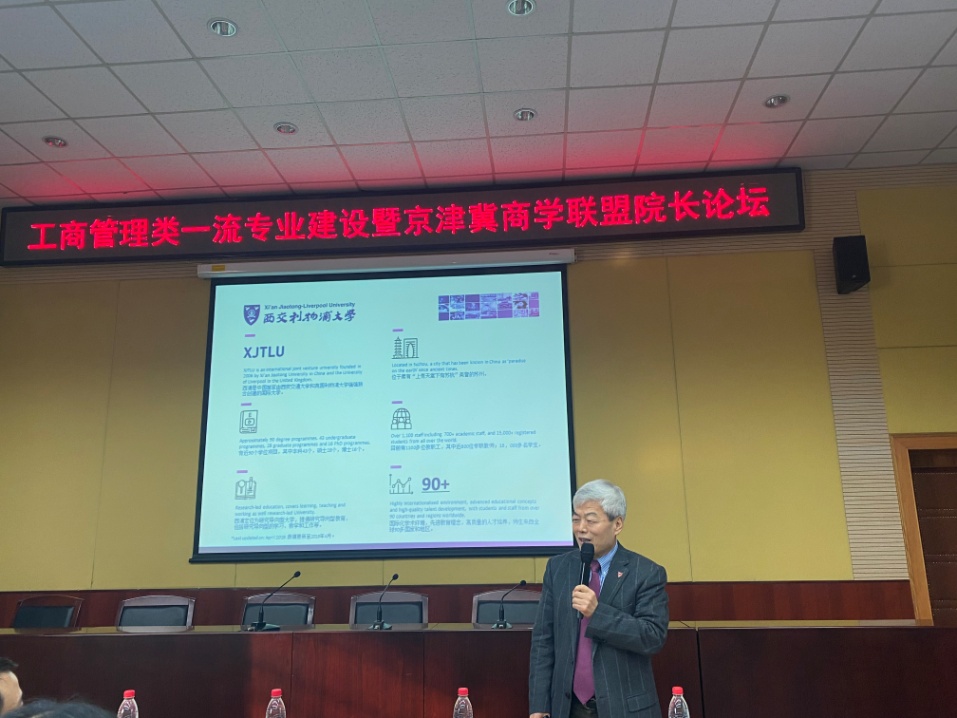 北京信息科技大学副校长于世洁致辞,向与会院长介绍了北京信息科技大学办学情况。随后,工商管理类教指委主任、西交利物浦大学执行校长席酉民教授应邀作了“工商管理类一流专业建设”的主题报告,对新商科的内涵及西交利物浦大学围绕新商科对工商管理类一流专业建设的探索进行了深入分析。主题报告结束后,来自京津冀商学联盟十九所高校的商学院院长围绕新商科建设及人才培养进行了深入交流,李耘涛也向各位院长介绍了yl23455永利官网在新商科建设及人才培养方面的具体举措。