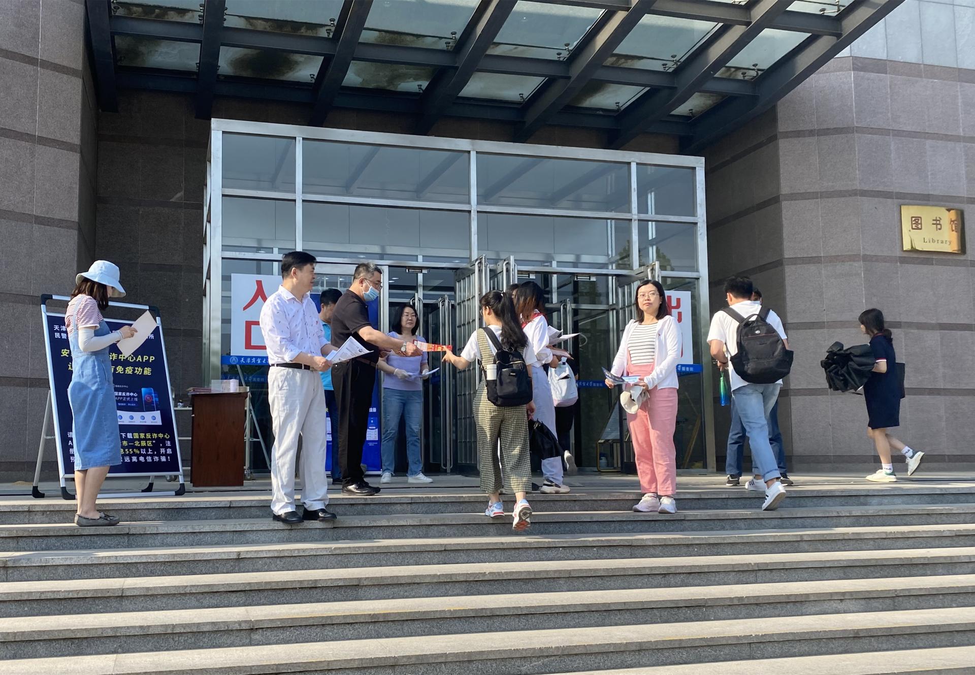 5月19日上午,图书馆直属党支部联合天津市公安局北辰分局佳荣里派出所在图书馆门前开展防范电信诈骗志愿服务活动。