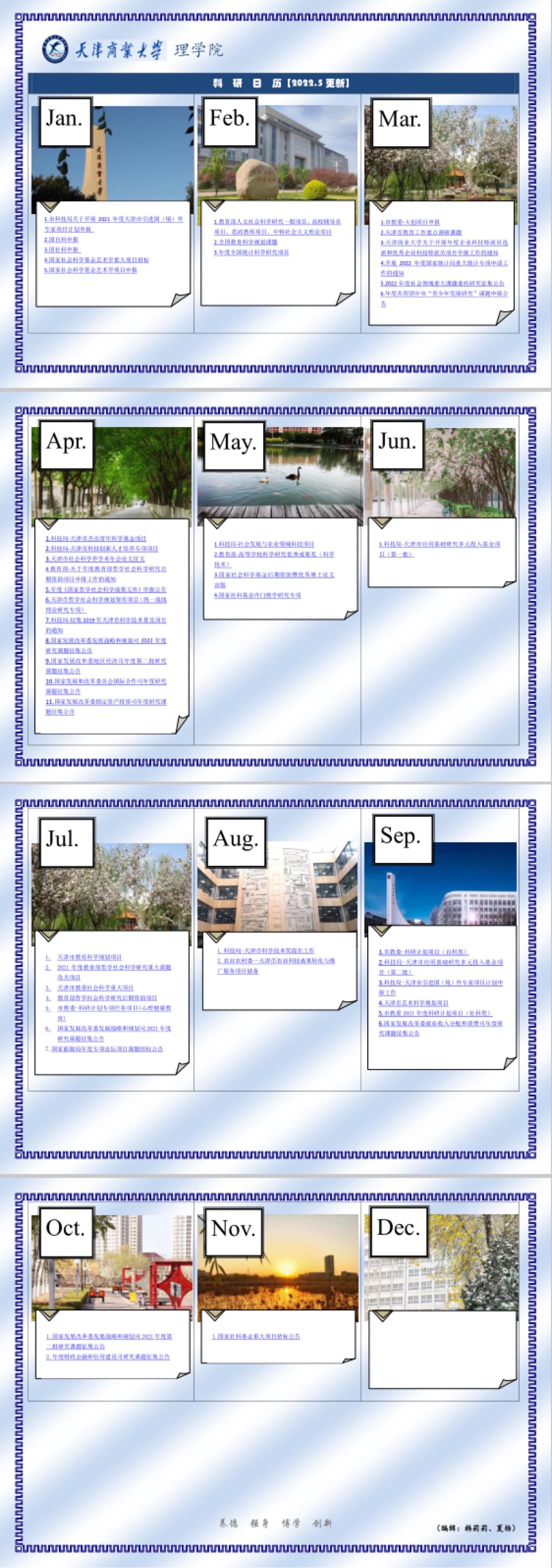 为了方便教师系统把握、实时查询科研资讯,避免错过项目申报重要节点,进一步提升科研服务成效,理学院结合学科特点和教师需求,专门为学院教师整理、编辑了科研日历。日历以月份为维度,对学院教师可申报的科研项目进行系统梳理,涵盖国家级、省部级、局级等项目48个。该科研日历提前预制超链接,让信息多跑路,教师一键点击就能直达信息源。今后将会根据教师需求和项目变动进行实时更新。