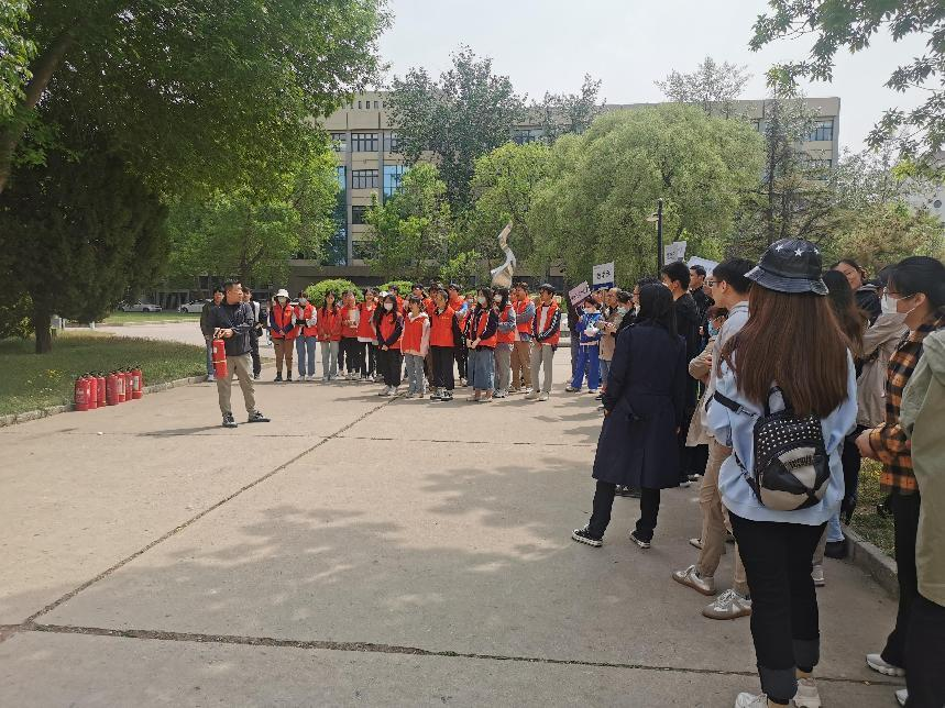 随着烟雾警报声响起,理学院各系教师和研究生在疏散引导员的指导下迅速有序撤离,并在指定地点集合。随后,保卫处相关工作人员在1号教学楼前仔细讲解了灭火器的使用规范和注意事项,在场教职工及学生积极参与了灭火器实操练习。