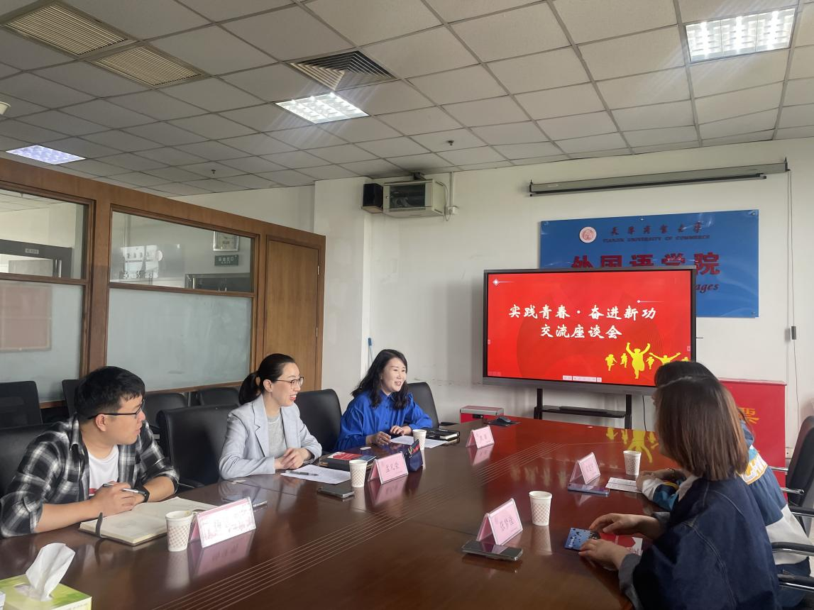 为进一步深入开展学习贯彻习近平新时代中国特色社会主义思想主题教育,弘扬五四精神,落实天津“十项行动”部署安排,5月6日上午,外国语学院与北辰区天穆镇团委开展“实践青春·奋进新功”交流座谈会,外国语学院党委副书记孟凡荣,天穆镇团委书记霍思宇、副书记张梦佳,外国语学院辅导员凯丽贝努尔·吐尔逊、杨佳明参加。