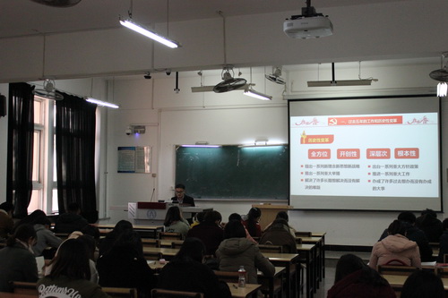 11月15日下午,管理学院在3教214室面向学院12个学生党支部的全体学生党员宣讲党的十九大精神。学院辅导员桑振龙作专题讲座。