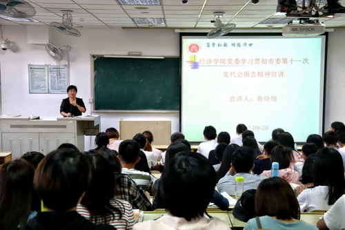 9月28日,经济学院开展基层党组织书记讲党课活动。学院党委书记鲁晓翔作市第十一次党代会精神主题宣讲。学院党委副书记张玉娟主持。院学工办主任王欣欣和经济学院全体学生党员聆听了党课。