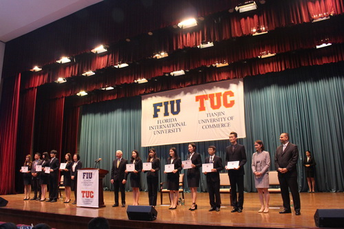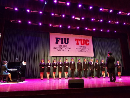 9月27日下午,TUC-FIU合作学院在科学会堂举办了2017年开学典礼暨迎新晚会。美国佛罗里达国际大学(以下简称 FIU)酒店与旅游管理学院院长Mike Hampton博士、助理院长Elizabeth Wesner、万豪集团代表天津瑞吉金融街酒店总经理Dario Pithard、合作学院院长孙钰、党委副书记冯延超、FIU 专业课教师,以及2015级和2017级全体同学参加了本次典礼。