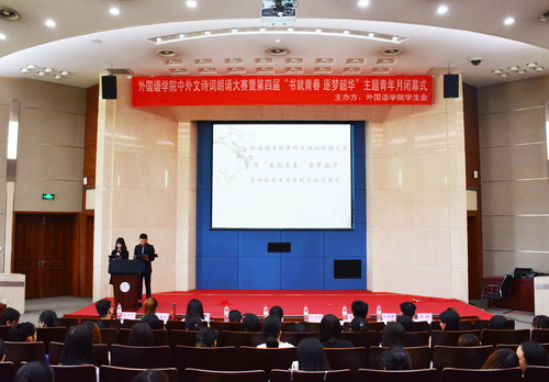 5月25日下午,外国语学院中外文诗词朗诵大赛暨第四届“书就青春,逐梦韶华”主题青年月闭幕式在图书馆国际报告厅举行。学院党委副书记朱晶、辅导员郭文雅、王琳出席。学生骨干及全体2016级学生参加。