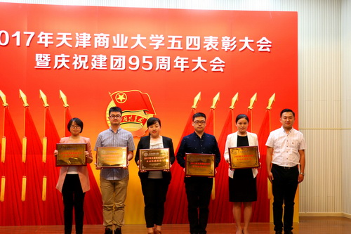 受到表彰的先进集体和个人代表依次上台领奖。2017年校级五四红旗团委代表、五四红旗团支部代表、2016年校级十佳社团代表、2017年天津市创新创业创优先进个人代表、2017年校级优秀团干部标兵代表、2017年校级优秀团员标兵代表分别上台发言。翟慧敏老师介绍了艺术学院团委在信仰教育、第二课堂实践、创新创业等方面取得的成绩,并表示将继续致力于为广大青年学生提供成长成才的广阔舞台、为学校的建设和发展作出积极贡献。罗梓予同学从思想建设、组织建设、学风建设和班级特色四个方面向大家介绍了TUC-FIU合作学院酒店管理(中美合作)1304 班团支部的优秀工作成果。杨帆同学分享了创行团队参加创新创业竞赛、参与社会实践等经历。商学院张阳老师介绍了依托科研成果,指导学生开展创新创业活动的经验;法学院的杨博添介绍了自己如何发挥模范带头作用,成长为优秀团干部的历程。生物技术与食品科学学院的邵广超从学生党员应如何参与团的工作角度,分享了自己的团学工作经验。
