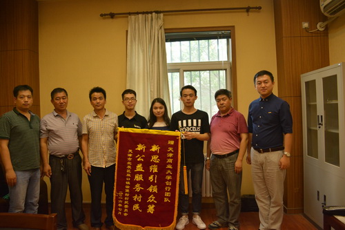 7月4日上午,北辰区双口镇徐堡村挂职干部王凯、李国明,村干部李培军、韩记福一行四人来到永利官网,将“新公益服务村民,新思路引领众筹”的锦旗送给永利官网学生创行团队。校团委书记辛佳澎、校社团联合会指导教师乔亮出席赠送仪式。