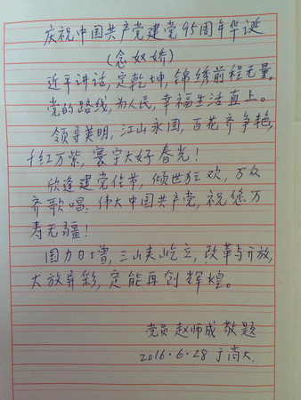 赵老师非常怀念在学校任教的时光,对党组织在他退休后,在生活、学习及其他各方面给予的无微不至的关怀和帮助深表感激,在建党95周年之际,作诗一首以表达自己的心情。