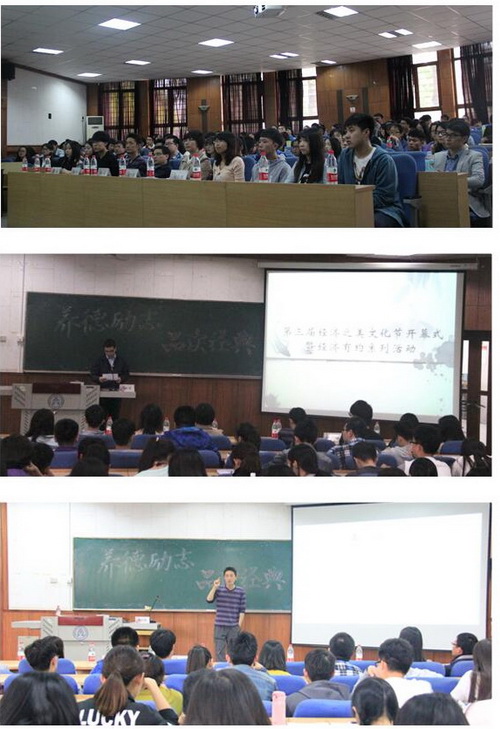 4月27日下午,经济学院第三届经济之美文化节开幕式暨经济有约系列活动第十一期活动在三教110 举行。本次活动的主题为养德励志,品读经典,特邀经济学院经济系黄卫华博士作讲座,院长刘小军、党委副书记张玉娟、国贸系辅导员杜志惠出席。