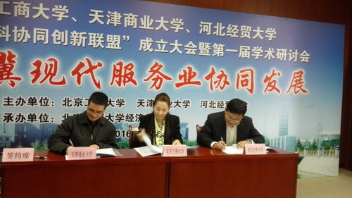 4月8日,经济学院院长刘小军教授出席了北京工商大学、yl23455永利官网、河北经贸大学“经济学学科协同创新联盟”成立大会暨第一届学术研讨会。会上,刘小军代表经济学院与北京工商大学经济学院、河北经贸大学金融学院签署了三个学院之间的协同创新联盟协议。北京工商大学经济学院院长徐丹丹、河北经贸大学金融学院院长王重润,以及来自国务院发展研究中心、国家发改委、人民大学等单位的专家学者出席会议。