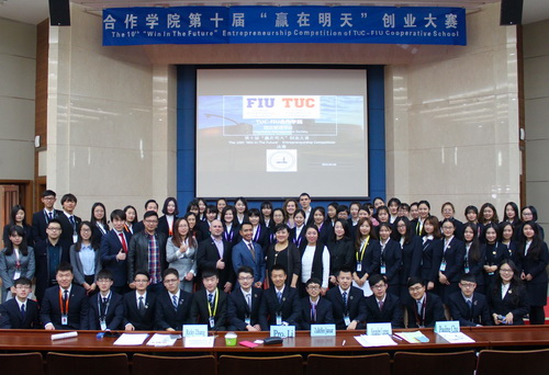 4月9 日下午,TUC-FIU 合作学院第十届“赢在明天”创业大赛在图书馆三楼国际报告厅举行。天津瑞吉金融街酒店餐饮部总监Zulkiflee Januar ,天津君隆威斯汀酒店餐饮部经理Alexandre Custeau ,天津生态城世茂希尔顿酒店销售部总监Pauline 等受邀担任本次大赛评委。TUC-FIU 合作学院酒店管理系主任李云飞,教师郭卓、刘海东、李慧、欧东润,2010 届优秀毕业生代表张欢及兄弟学院十余名学生代表参加。