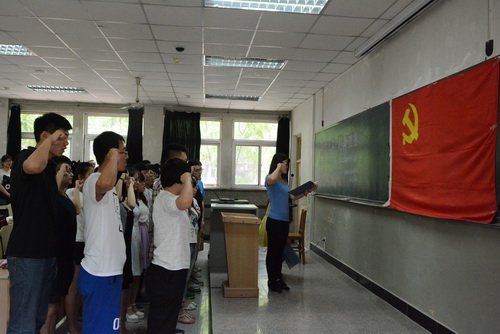奏唱国际歌后,全院2015 年下半年以来发展的预备党员在学生党建办公室主任张雨菲的领誓下,面向党旗庄严宣誓,背诵入党誓词。宣誓之后,老师为党员们佩戴党员胸徽,以示鼓励。随后,预备党员丁新宇作为代表在发言中表示,在以后的人生道路中,将会加强学习,对党忠诚,积极工作,为共产主义奋斗终身。学院学习部部长晋利君、生活部部长张薇分别就本学期的学风建设工作安排及安全稳定工作要求进行了布置。