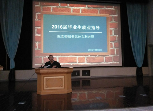 孙文利首先介绍了近几年学院就业的总体情况,从“毕业生总量持续攀升、就业结构性矛盾突出、宏观经济走向新常态”等方面阐述了当前就业严峻形势。然后,从职业生涯规划、树立正确就业观、简历制作及面试注意事项、就业政策解读等方面为同学们做了细致的指导。他勉励 2016 届毕业生要积极调整心态,做好职业规划、找准定位,坚定理想, 勇于拼搏,争取在毕业前都找到一份满意的工作;并鼓励有想法、有能力的同学积极创新创业,实现青春梦想,成就精彩人生。
